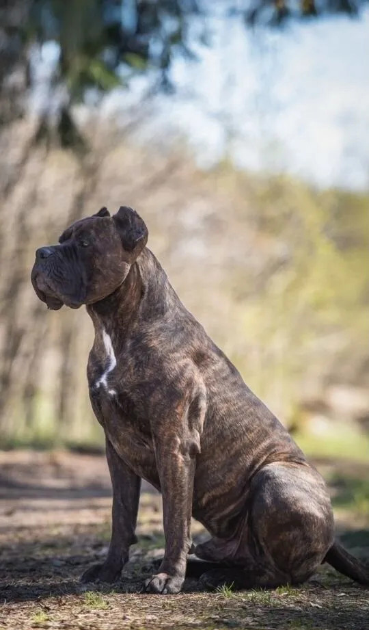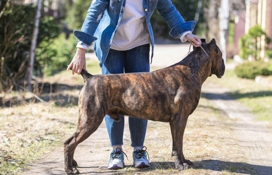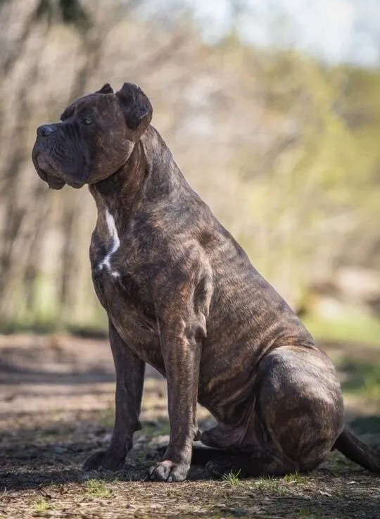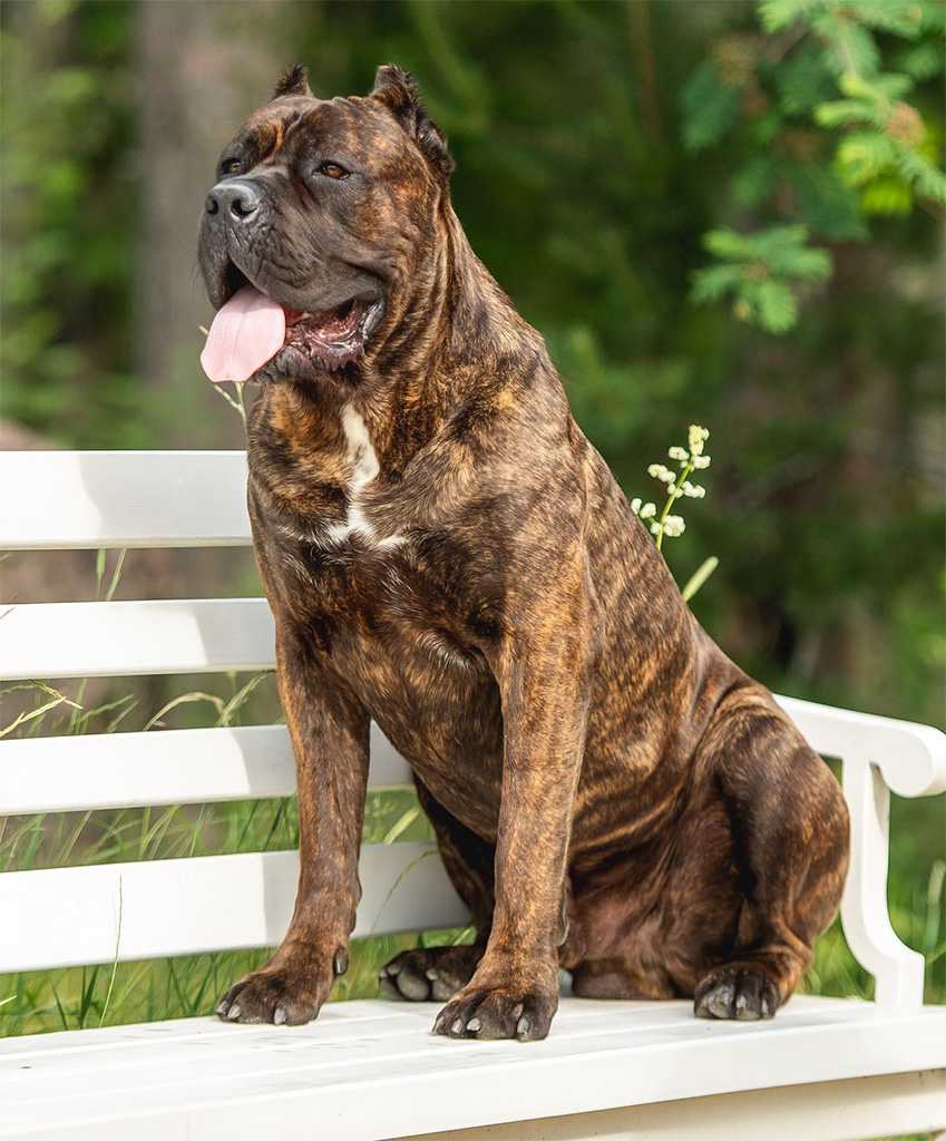 Кобель Кане Корсо тигрового окраса. Обладает строгим характером, сильный, выносливый.